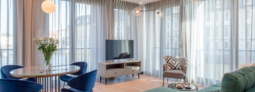 wszędzie, gdzie sąsiedztwo tego wymaga, apartamenty dają możliwość komfortowego przysłonienia okien